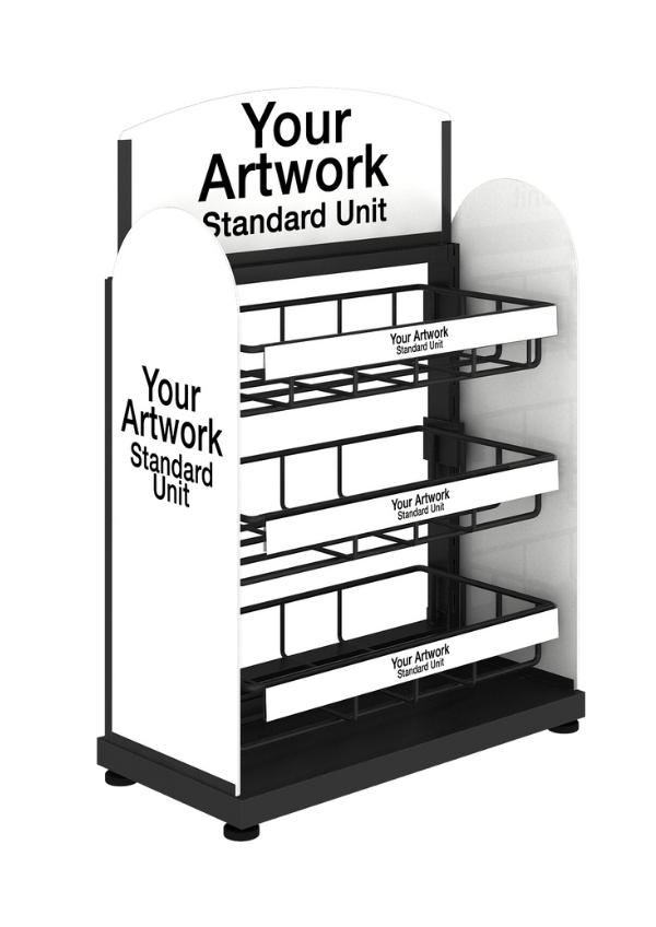 Off-the-shelf unit with x3 wire dump bin shelf. We hold stock of these units therefore they have a shorter lead time when compared to the customised version.